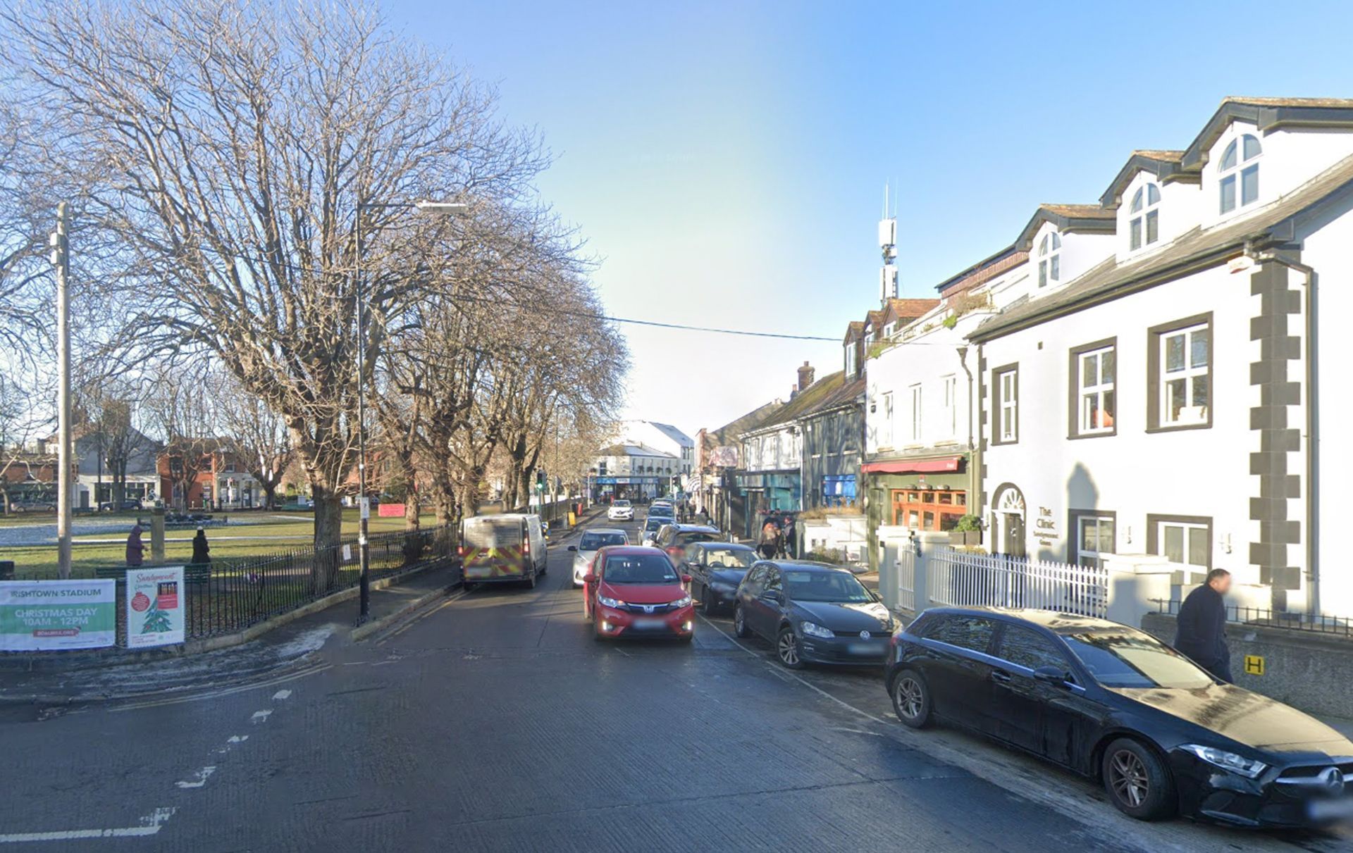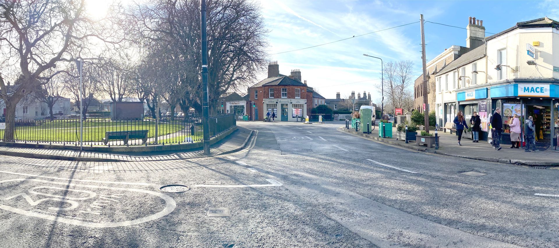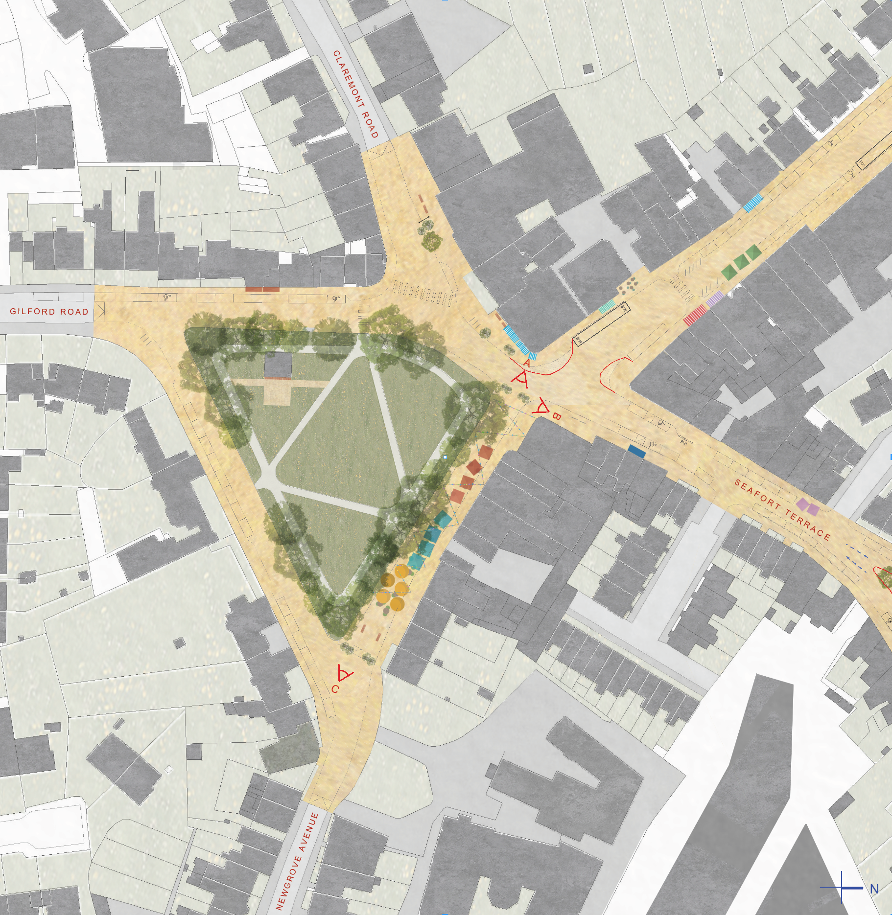The north side of the Sandymount Green triangle is the most vibrant commercially and is the only side through which no buses pass. It is also south-facing with the most frequently used entrance to the green at its centre. It is the side of the Green best-suited to pedestrianisation.