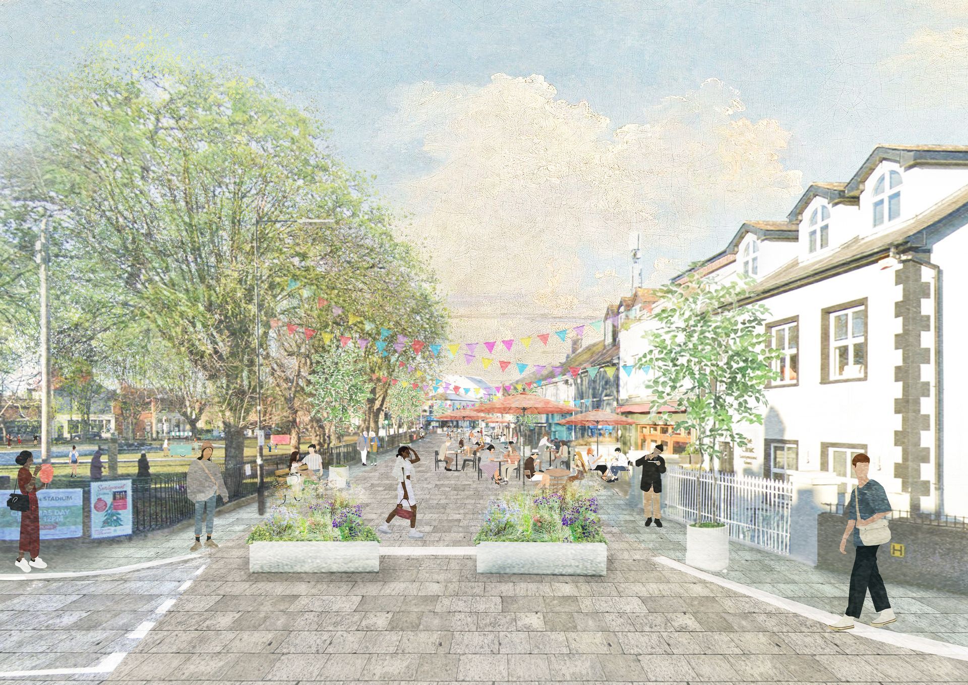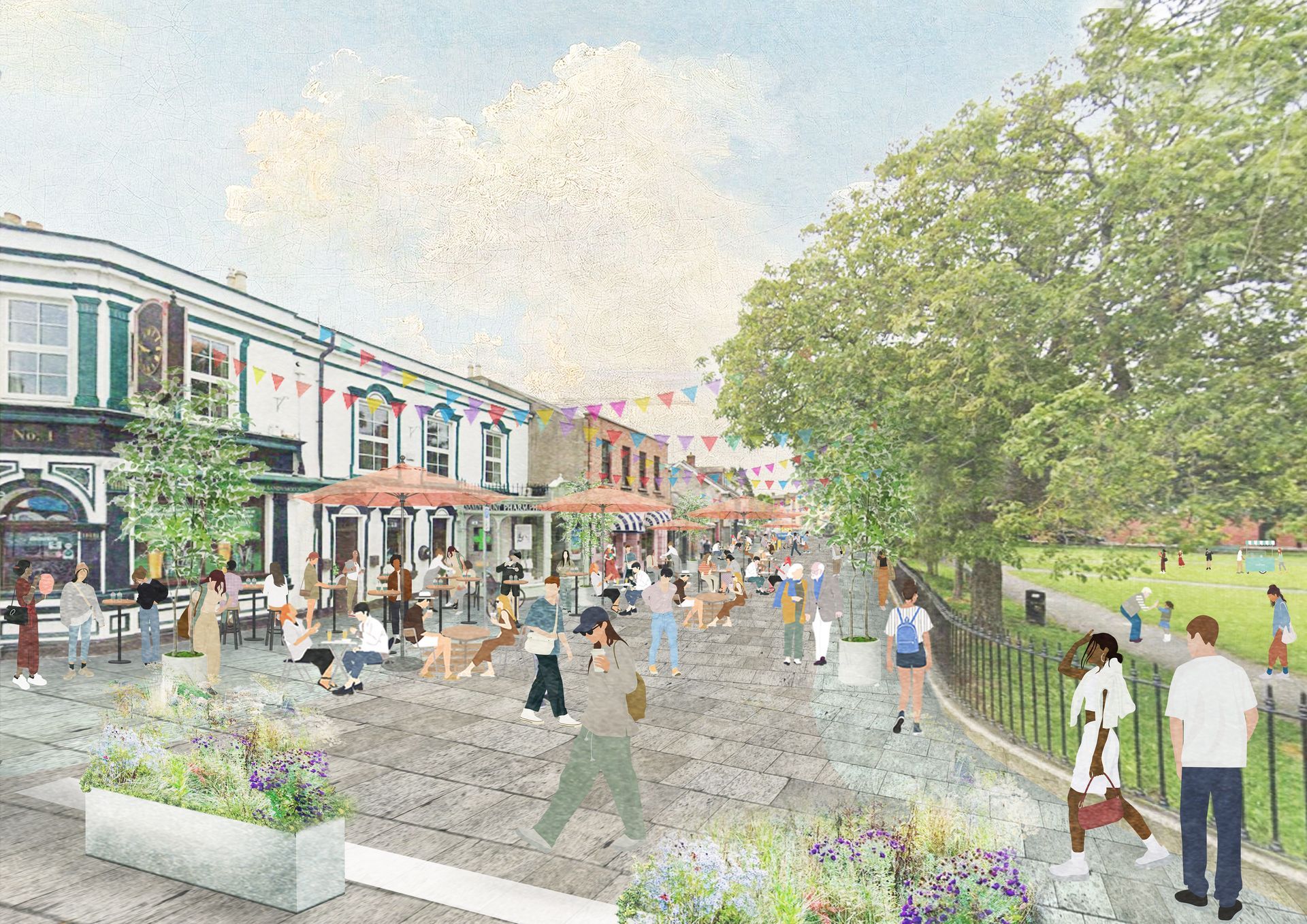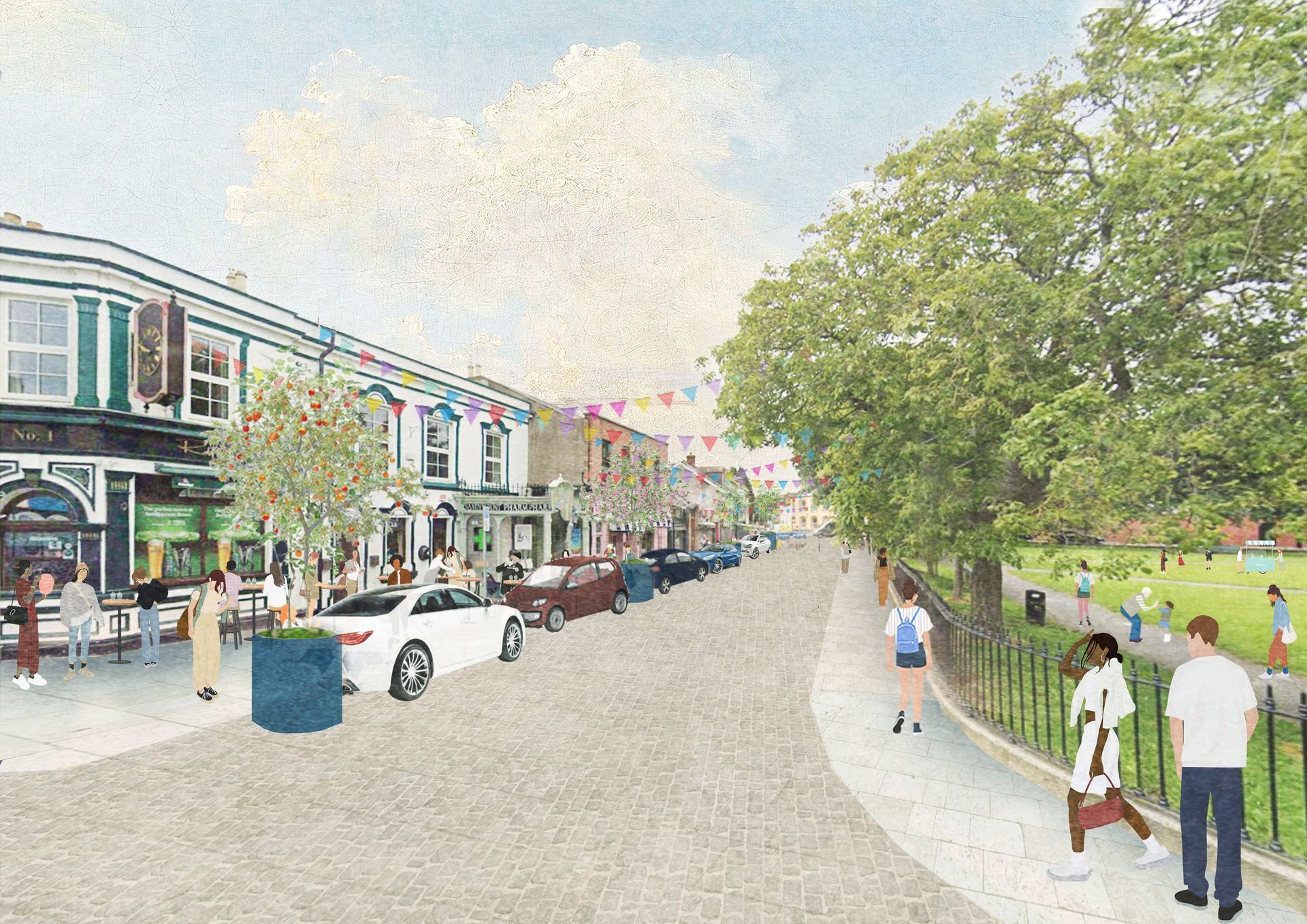 Imagined proposal view of the north-east side of the Green during pedestrianised period