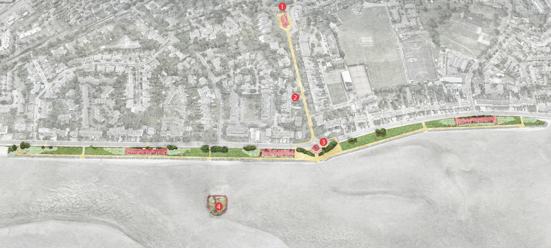 1. St John’s Church 2. St John’s Road 3. Martello Tower 4. Former Merrion Pier and Baths Aerial view showing imagined interventions at the promenade, with existing car parks retained.
