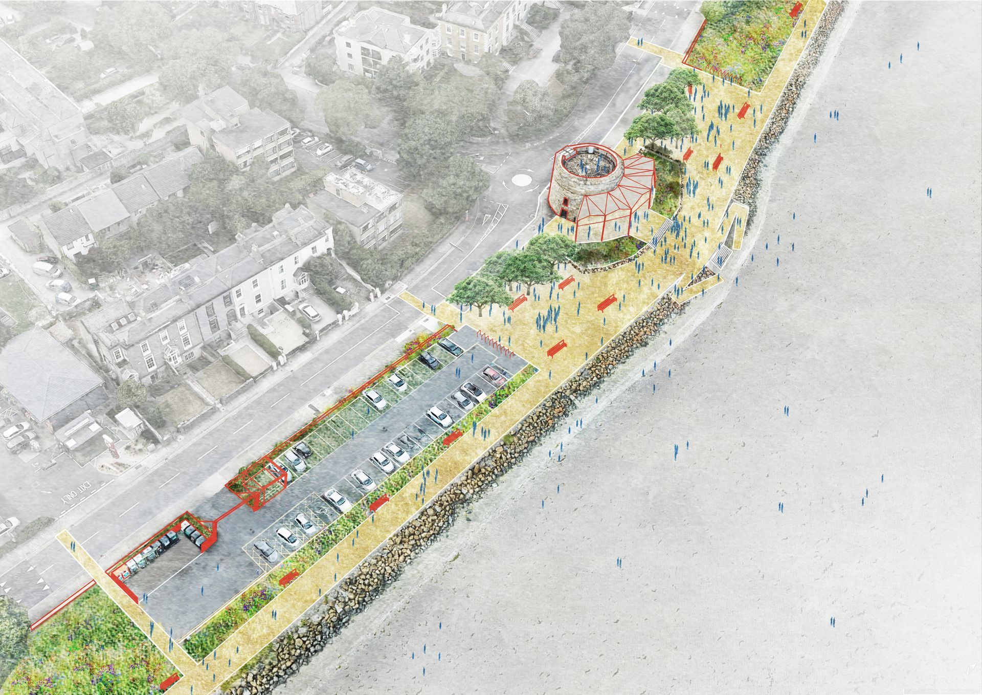 - enhancing surfaces around the Martello Tower; resurfacing with hardscaping while retaining the existing trees that buffer traffic from the Strand Road.