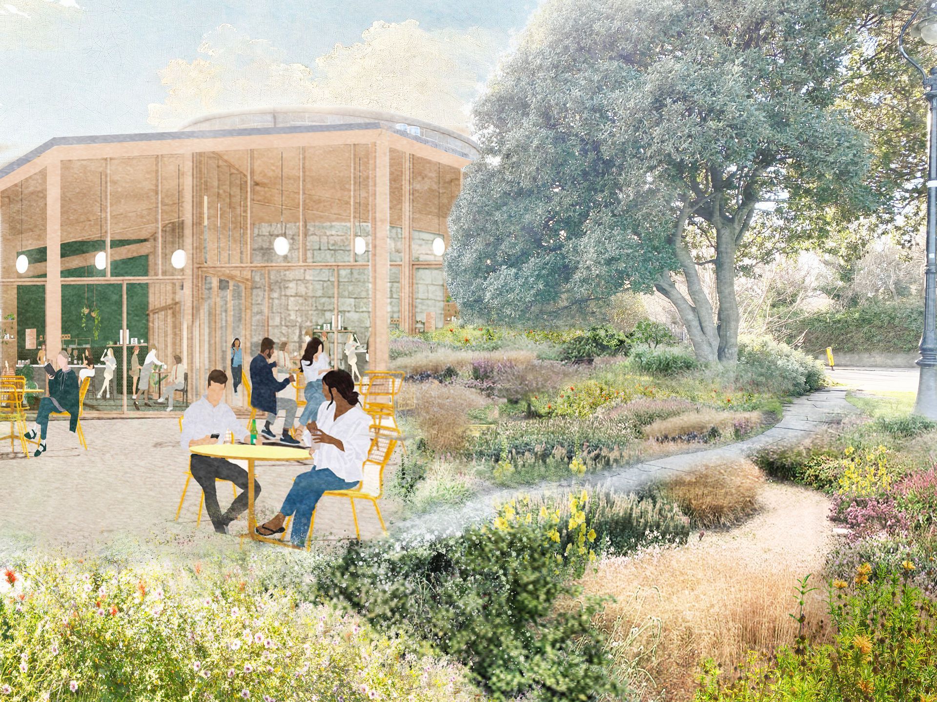 The Martello Tower currently has a sunken garden, retained by boulders with a steel guarding on top. This could be transformed by more intensive planting into a zone for biodiversity that enhances the quality of the space. The existing 20th C. lean-to structures could be adapted to have an open façade for a publicly accessible use that enjoys the aspect over the bay, eg. a café. Opening up the volume for greater public transparency allows views both to the interior and to the outer panorama, while utilising the structure and footprint of the existing extension to create a significant public amenity space.