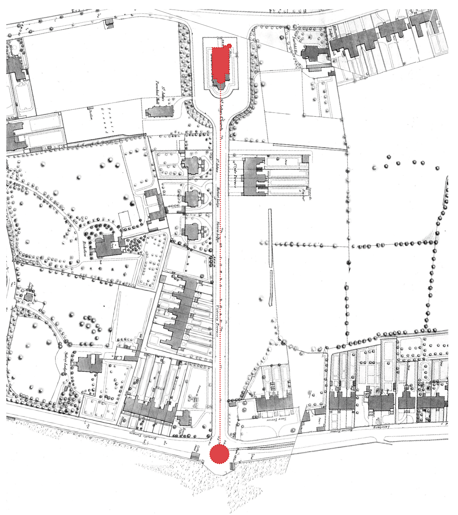 Historical photographs showing the original proximity between the Church and the waterfront which was then at the end of Leahy’s Terrace (water marked in blue).