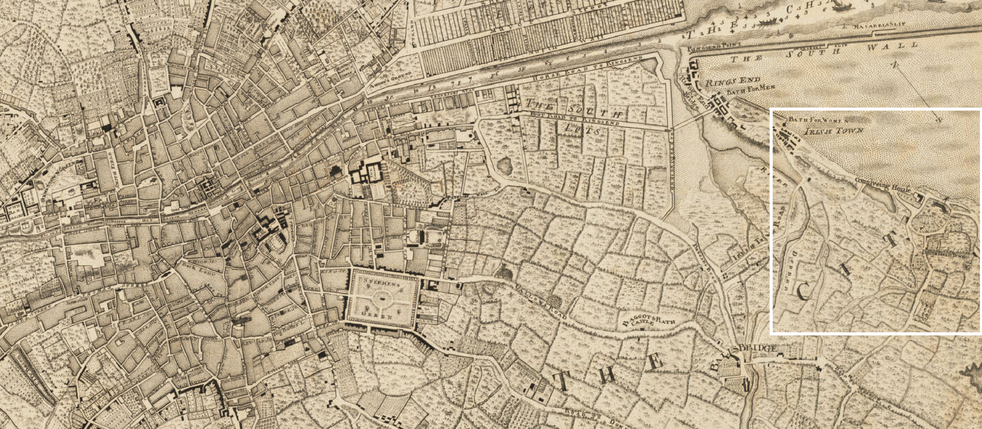John Rocque's 1756 map of Dublin and excerpt displaying the first development of Sandymount then known as Brickfield Town within the Fitzwilliam estate