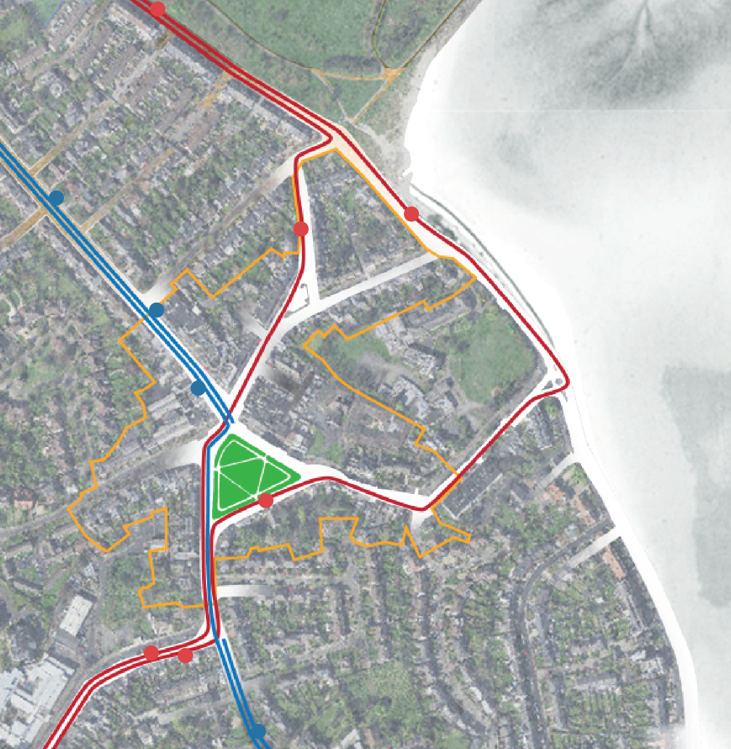The westbound S2 route travels via New Grove Terrace in lieu of Dromard Terrace and by the South side of the Village Green. There is no public transport route along the northside of Sandymount Village Green. The westbound route connects to a number of urban villages including Ranelagh and Rathmines to as far as Heuston Station.