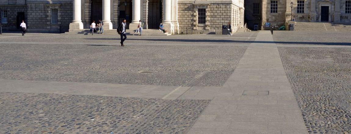 Cobbled surface in Trinity College Dublin, with flat granite surfaces between to allow for accessible navigation.