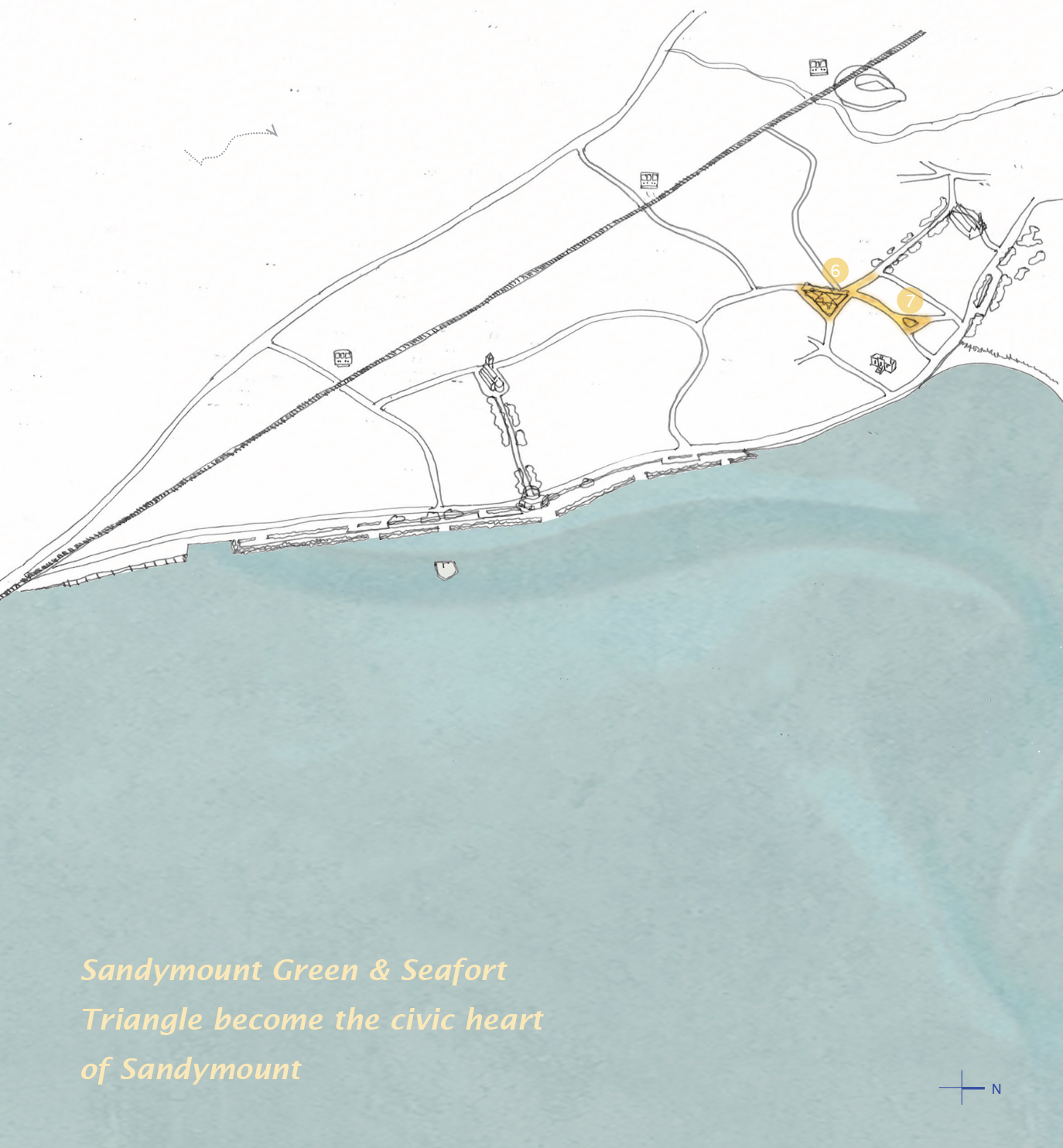 The Ordinance Survey Map of 1889 shows this triangular civic space having a fountain and a pump. Through our research, the relationship between the triangle at Seafort Avenue has the distinct possibility of being more formally linked to the Village Green. These two triangles describe the main public realm of Sandymount Village. Ideas include: Re-claiming this space, creating a public amenity space with seating, trees and increased biodiversity, while at the same time retaining its parking facility.