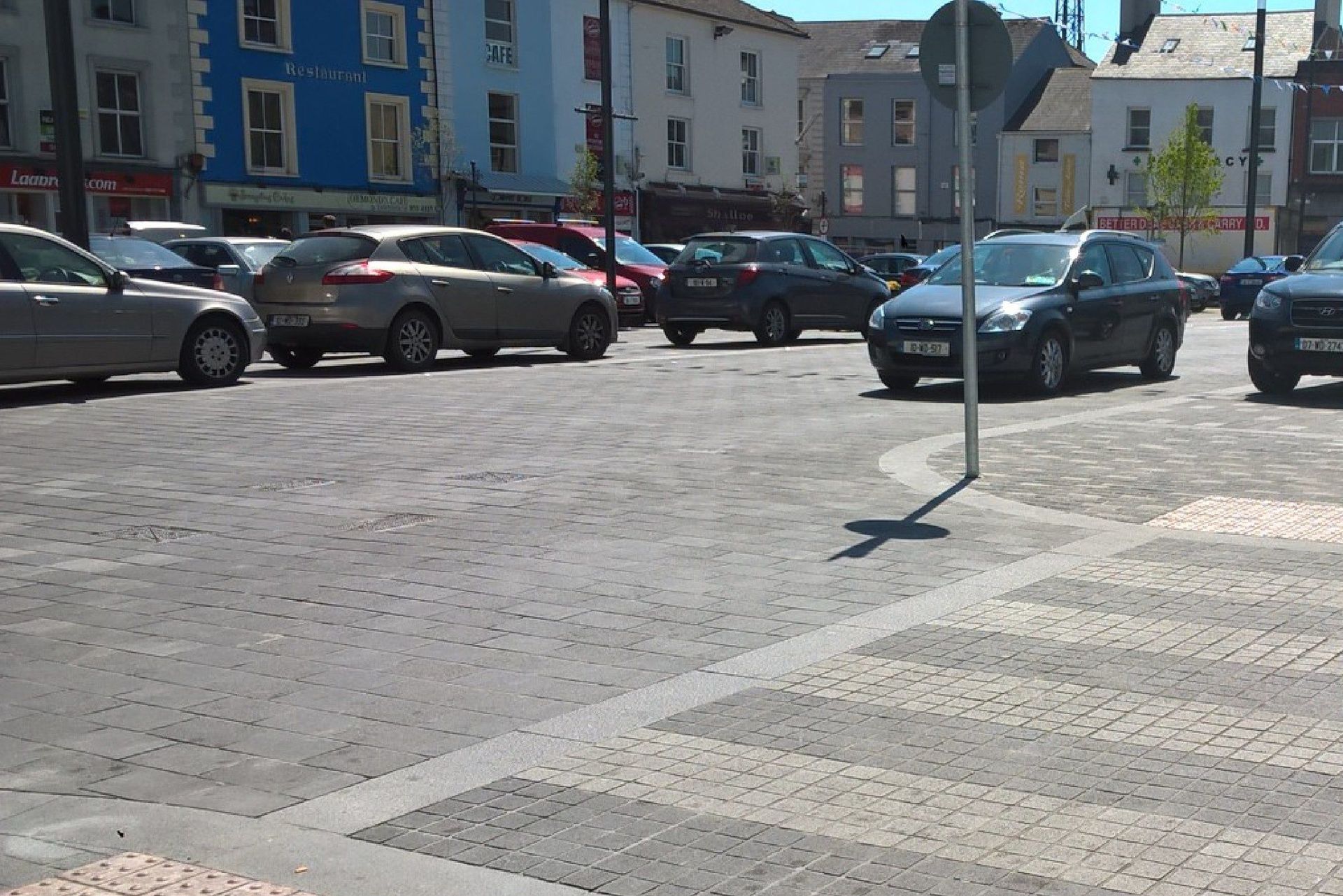 Continuous paving / road surface in Dungarvan town, Waterford, warning drivers that they are sharing the surface with pedestrians