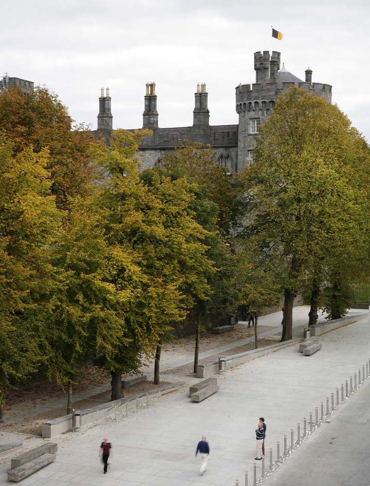 Paving in Kilkenny, with visual change of surface & bollards between pedestrianised/trafficked areas. By GKMP Architects.