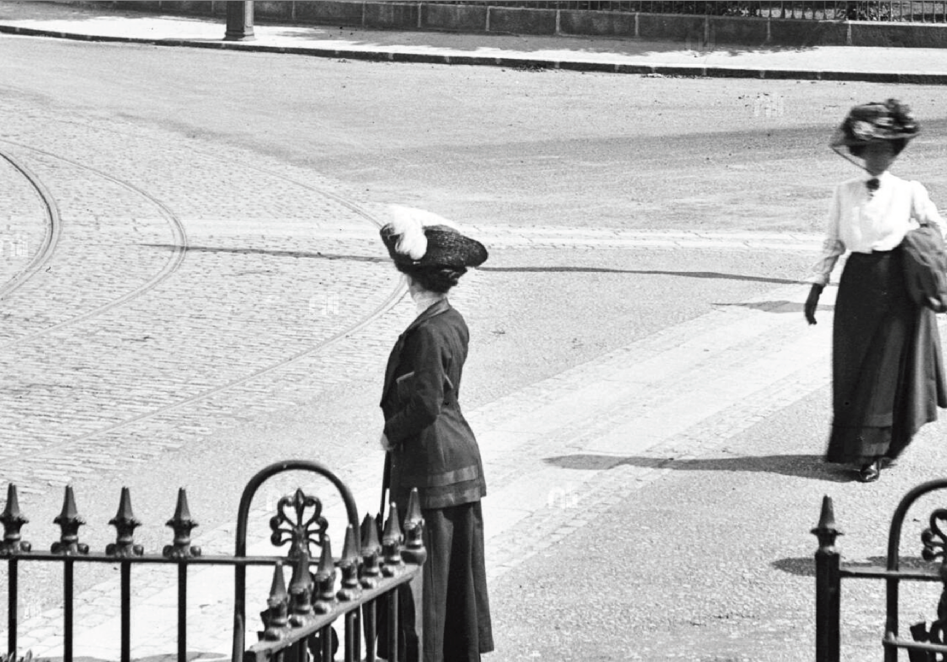 Historic image showing cobbled road with change in surface at pedestrian crossings, alerting road users to the potential presence of pedestrians
