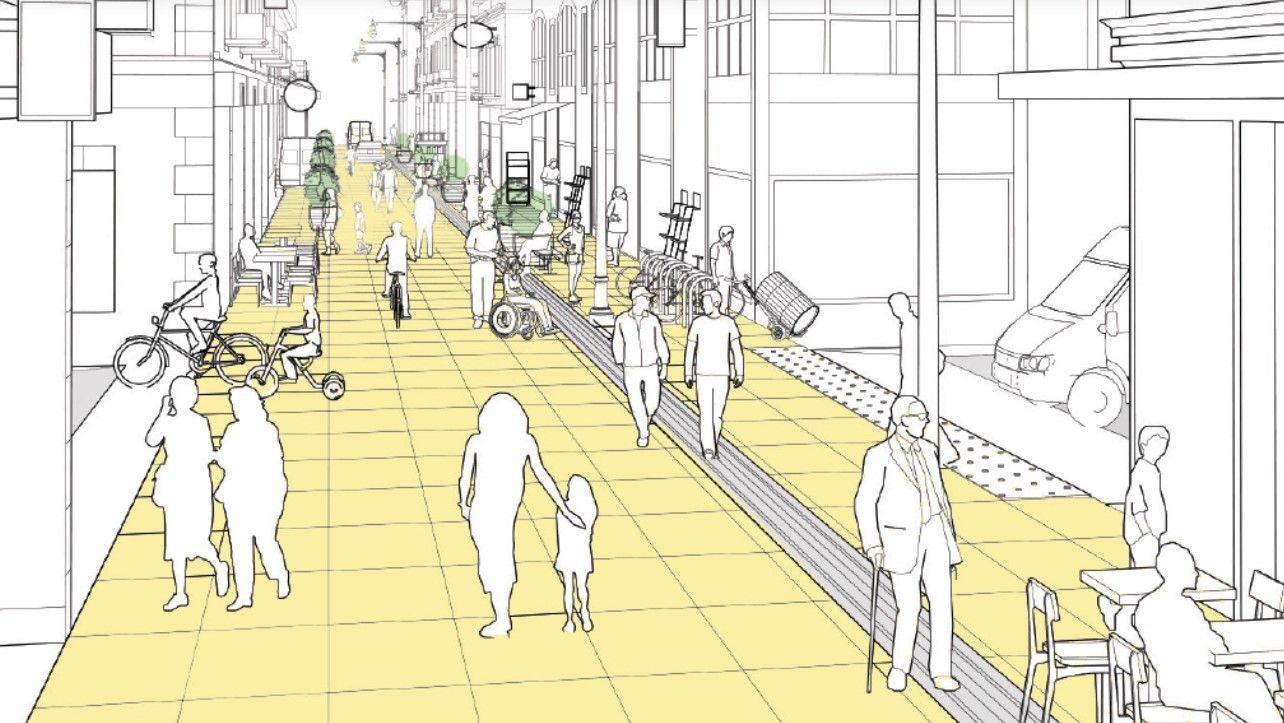 Introducing table crossing & shared surfaces, reducing the radius at bends and reallocating space to footways by narrowing carriageways can all affect to sooth the pace of traffic. Calmer civic space has the effect of encouraging people to remain and inhabit space, as it is perceived as safer, quieter and more comfortable.